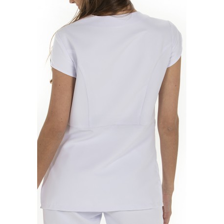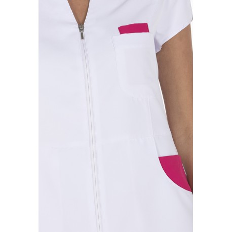 Chaqueta de manga corta femenina, confeccionada para profesional de clínicas, comercio, fisioterapeutas, spa, etc. Consta de cortes en mangas, costadillos inferiores, cremallera de malla invertida que reduce el deterioro por rozamiento. Posee dos bolsillos inferiores dobles y otro, superior doble. El largo aproximado es de 68 cm. Se compone de 100% Poliéster.