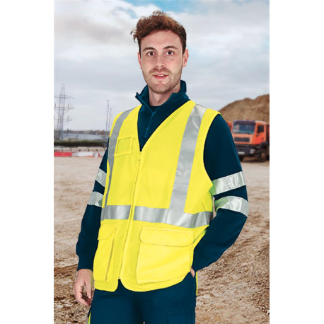 Chaleco ligero de alta visibilidad, con bolsillos, aconsejado en empresas de obra civil, puertos, aduanas y fronteras, lonjas, actividades pesqueras, plataformas petrolíferas, mantenimiento viario y de carreteras, red ferroviaria, industria pesada, y similares. También está aconsejado para camioneros, transportistas, repartidores y personal de albañilería o construcción. En definitiva, es una prenda cuyo uso se recomienda en aquellos trabajos en los que sea necesaria una visibilidad añadida frente a los demas.
