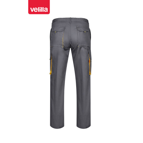 Pantalón laboral bicolor Velilla 103004. Tejido de sarga ligera (200 gr) resistente y transpirable. Diseño multibolsillos con refuerzo trasero. Ideal para uniformidad e imagen corporativa industrial.