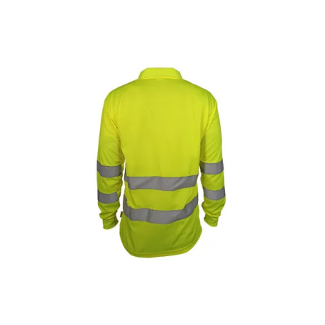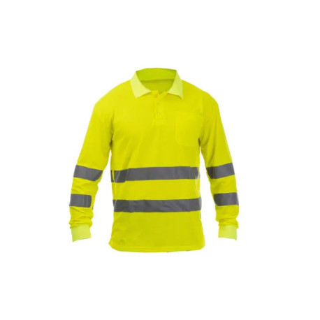 Polo BEEWORK RIVER HV POLO LS diseñado para trabajos con necesidad de alta visibilidad, destaca por su tejido técnico bird-eye transpirable y ventilación en axilas, ofreciendo confort en jornadas con calor sin renunciar a la señalización con bandas reflectantes.